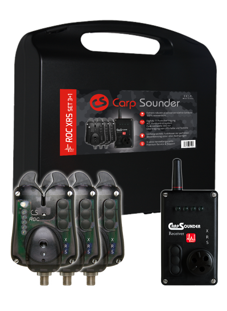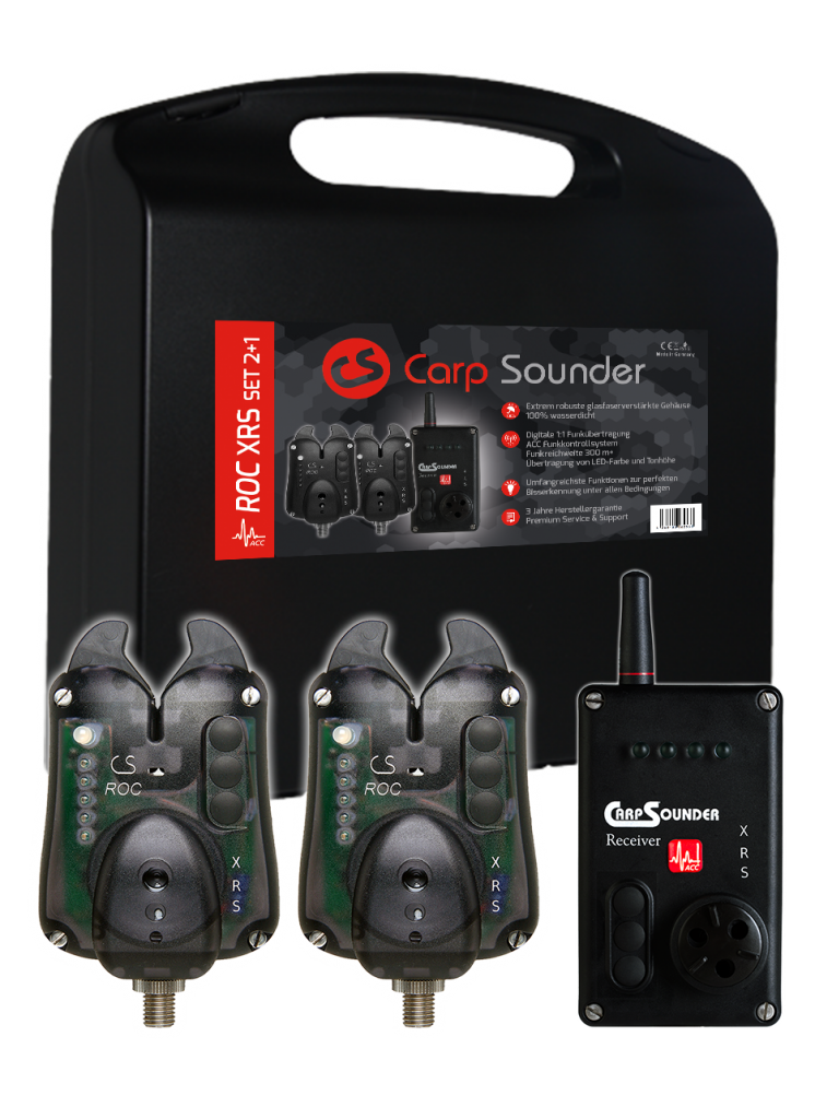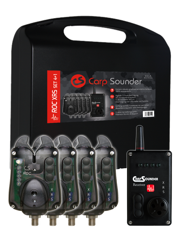 Volumen, ajuste de tono, ajuste de sensibilidad, configuración de color del LED (rojo, amarillo, verde, azul, púrpura, cian, blanco y LED apagado), luz nocturna (se puede apagar), indicador de nivel de batería. Banda de luz para la detección óptica de mordidas. control de la cocina. Detección de picadas falsas mediante pantalla visual y doble tono. Supresión automática de fluctuaciones. Carcasa de poliamida reforzada con fibra de vidrio. Impermeable y diseñado para las condiciones más difíciles de pesca de la carpa. Junto con el nuevo receptor XRS ACC, el sistema ROC ha llegado en el futuro.