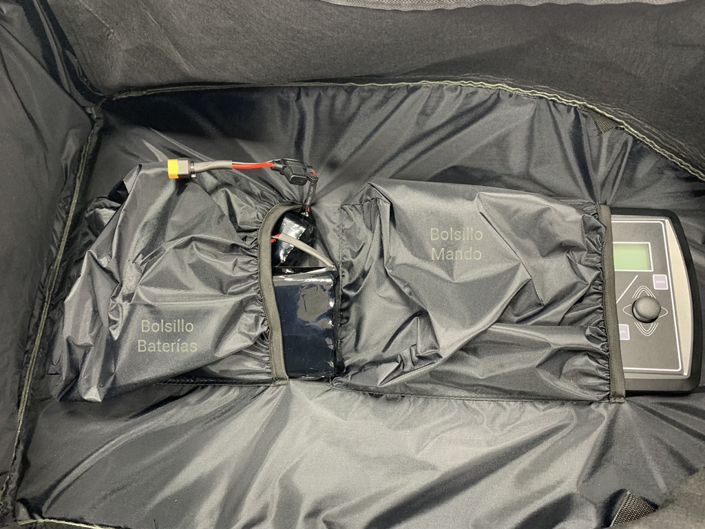 En el interior hemos incorporado dos prácticos bolsillos, uno para el mando y antenas y otro para baterías y cargadores.